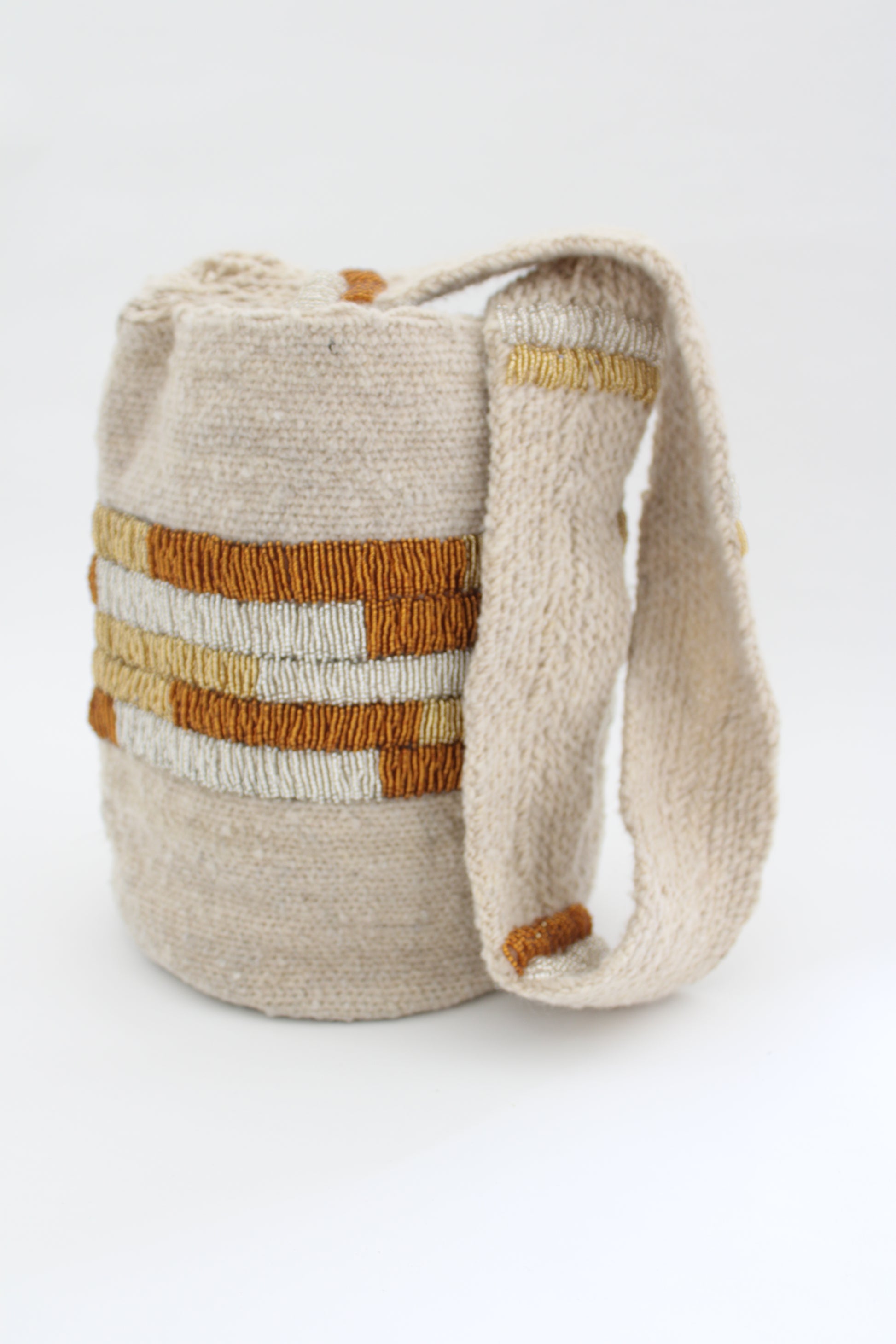 Our Special handmade Golden and Earth cross bag crafted by Ethnic Indigenous in the Sierra Nevada de Santa Marta mainly by Gwati (Women of the ethnic Group). In sheep wool and embroidered Japaneses Miyuki crystals by brilliant Artisans