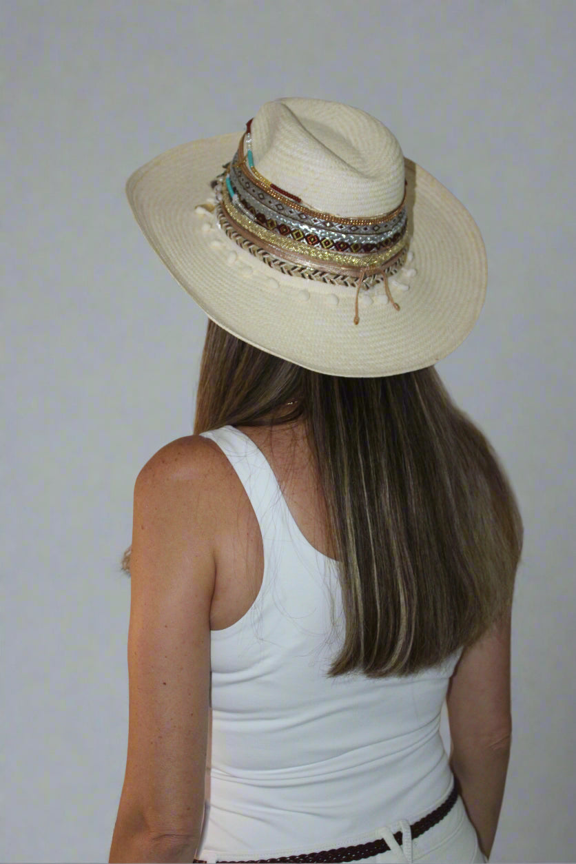 This toquilla palm hat is handmade and adorned by skilled female artisans. It features a beautifully crafted copper vintage boat wheel and is lightweight, eco-friendly, and blends heritage with modern fashion.